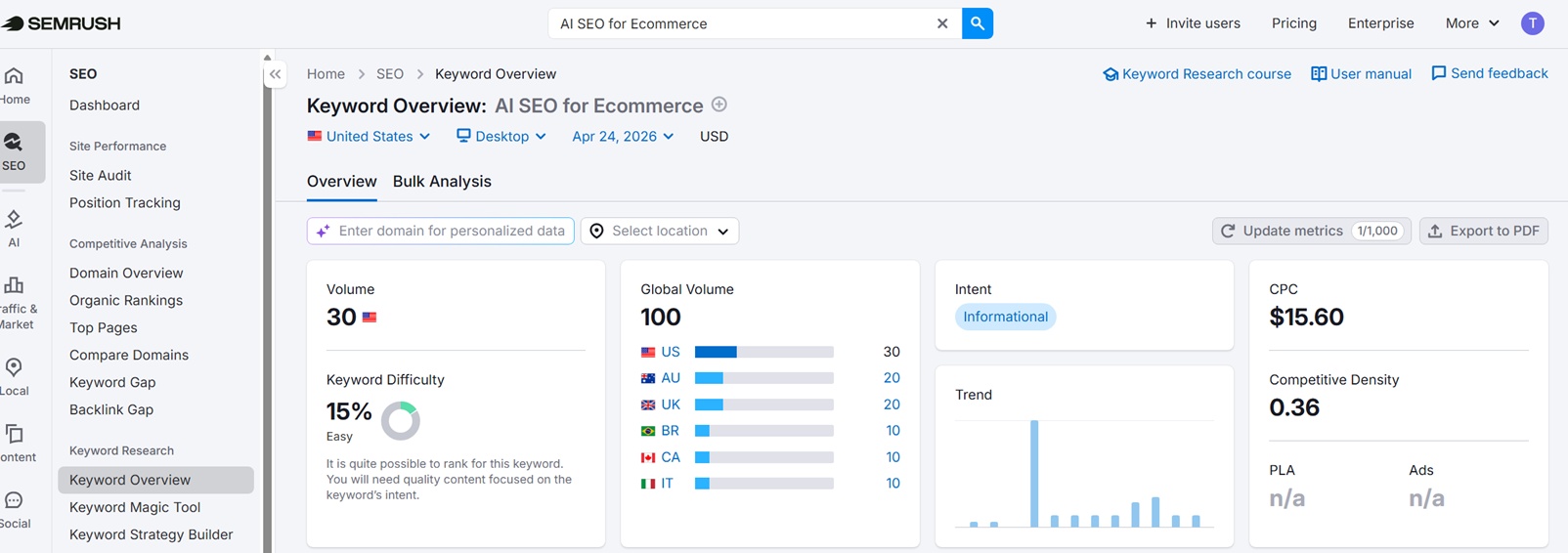 - SEO Strategy: Based on the search terms report, I’m creating an AI SEO for E-commerce dedicated landing page to go after that phrase