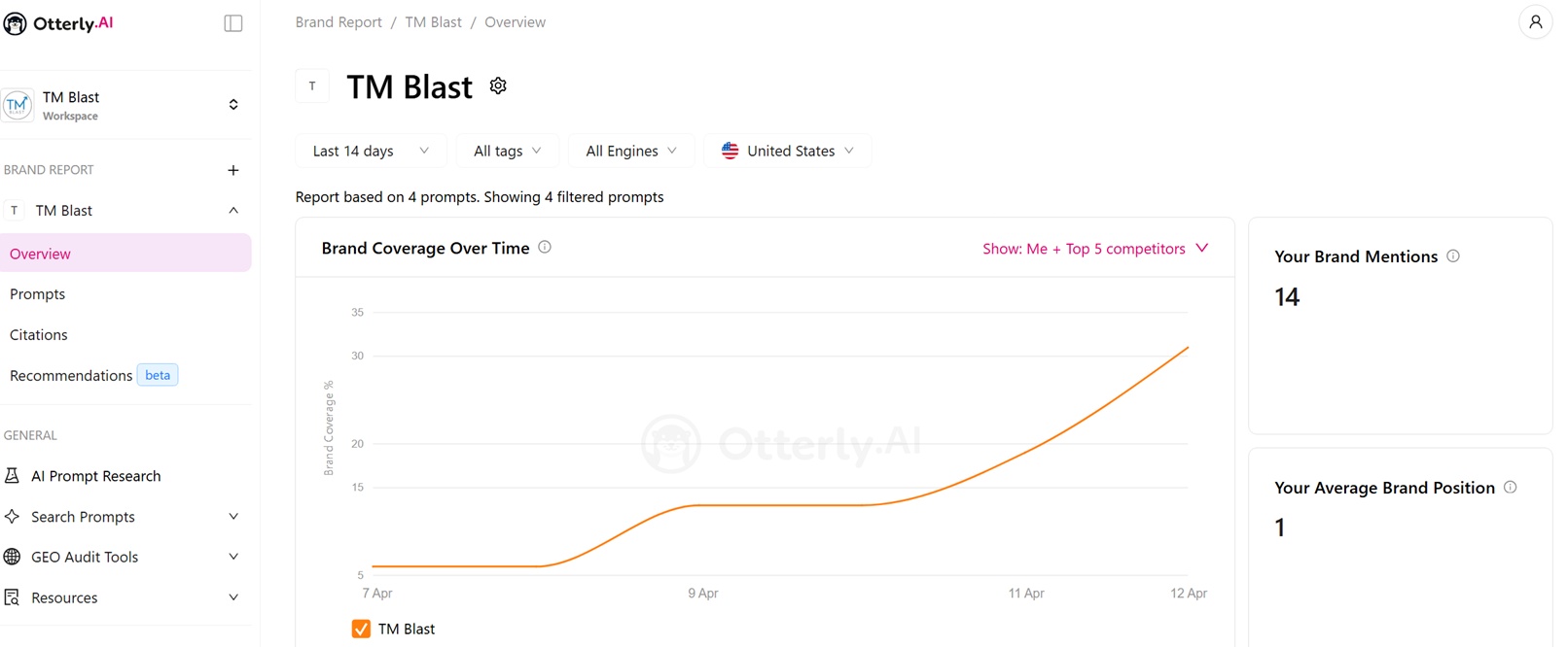 In two weeks, TM Blast went from 6% daily brand mentions across ChatGPT, Google AI, Perplexity, and CoPilot to 31%.